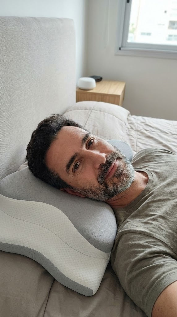 Cómo ayuda ErgoContour™: Su espuma memory foam adaptativa distribuye la presión de forma pareja, ofreciendo soporte ideal para cuello y cabeza.